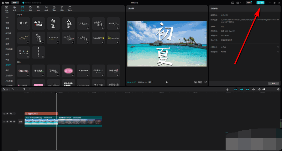 第八步:编辑完成后点击右上角的导出按钮,或者使用Ctrl+E快捷键导出视频就可以了。