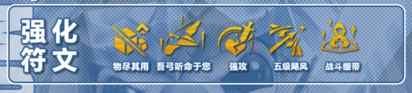 符文方面最优:物尽其用、吾弓听命于您、强攻、五级飓风、战斗绷带、