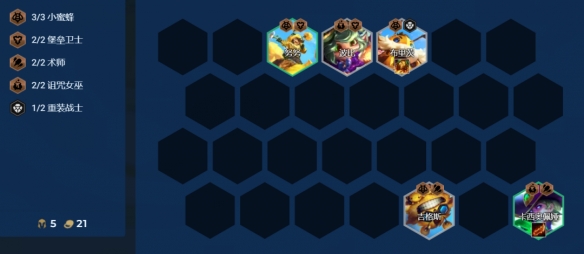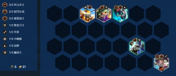 这套阵容搭配上比较简单,可以说核心就是4堡垒+3魔战士,对局中期属于单C阵容,但等到9人口后,多核心启动上分非常得高。