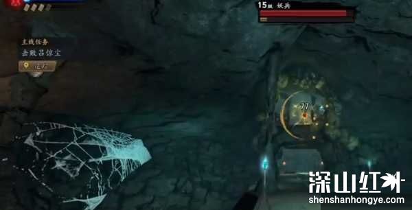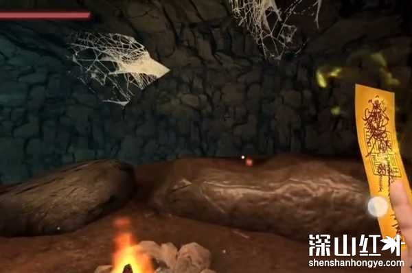 在成功清理掉挡道的小怪后,你会发现前方有一条小道。大家只要沿着这条道路一直前进即可。直直往前走就能够看到前面有火堆,上面还有蜘蛛网,上好的石料就在这里了。