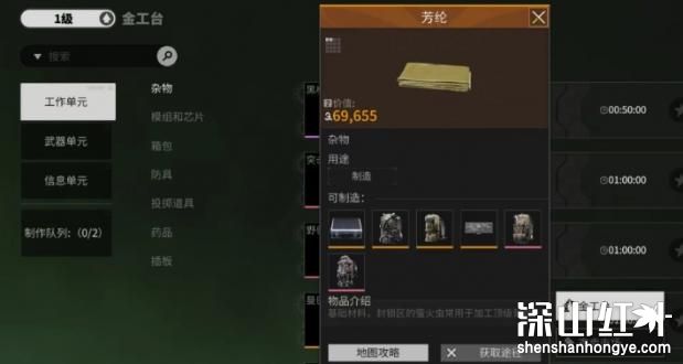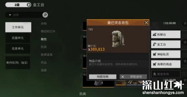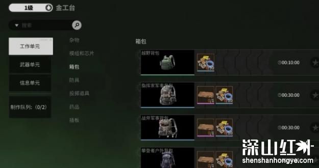 此外,在金工台中自行打造也是关键的获取方式。打开金工台,选择工作单元,其中包含多种可制作选项,箱包便是其一。点击后,能看到各个等级的箱包,从基础的越野背包,到战斧军事背包、砂岩战术背包、野兽突击背包、奇迹突击背包等,种类繁多。选择要制造的箱包类型,即可查看所需材料。