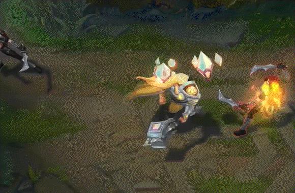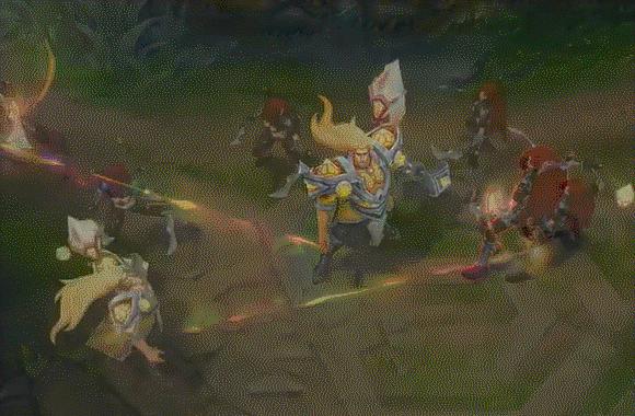 W:塔里克的W会用一种彩虹的光芒来链接对手,在队友身上会出现宝石,光芒四射的。