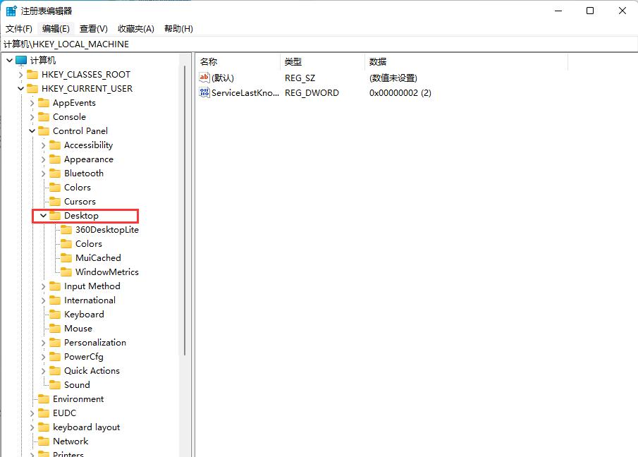 2、进入注册表编辑器后,依次点击左侧的“HKEY_CURRENT_USERControl PanelDesktop”,如下图所示。