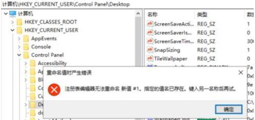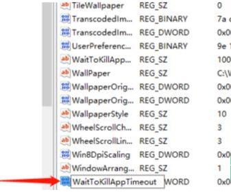 4、如果弹出重命名时产生错误,该值名已存在的提示框,则说明此文件已存在,直接在右侧找到“WaitToKillAppTimeout”文件,双击打开,将窗口中的“数值数据”改为“0”,点击确定保存即可,如下图所示。