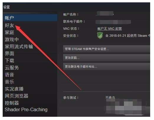 接下来Steam设置窗口中,点击“好友”菜单项。