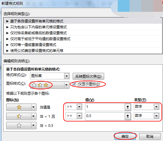 在弹出的【新建格式规则】对话框中【图标样式】选择【3个星形】,勾选【仅显示图标】。