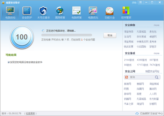 1、可以对设备进行一键全面体检,然后进行分析处理,还可以及时对电脑漏洞进行扫描修复。