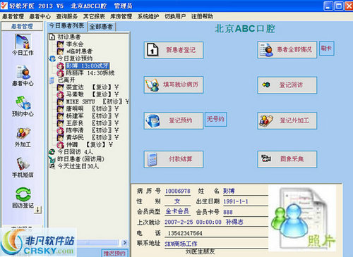 1.患者管理,包括患者登记和查询、填写病历、登记回访、短信等功能。