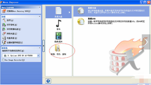 2.选择“刻录数据光盘”,点击“图像、项目、复制”一栏,在右侧选择“光盘图像或保存的项目”,弹出添加图像文件的窗口。
